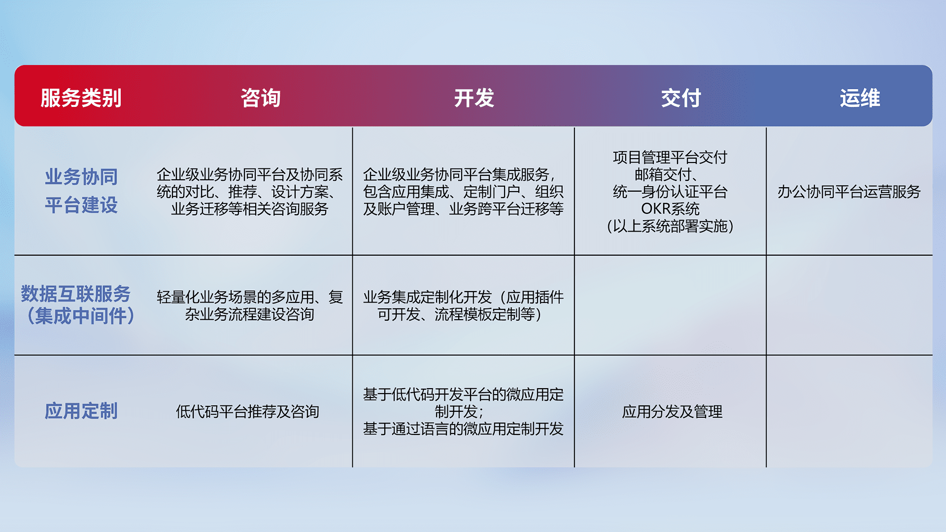 针对钉钉、、企微、、IDaas等平台级产品提供产品的规划、、方案、、、交付、、、、定制化开发等服务,,实现如统一协同办公、、智能客户服务、、混合会议管理、、智能数据查询、、等业务场景,,,实现数字化转型。。。