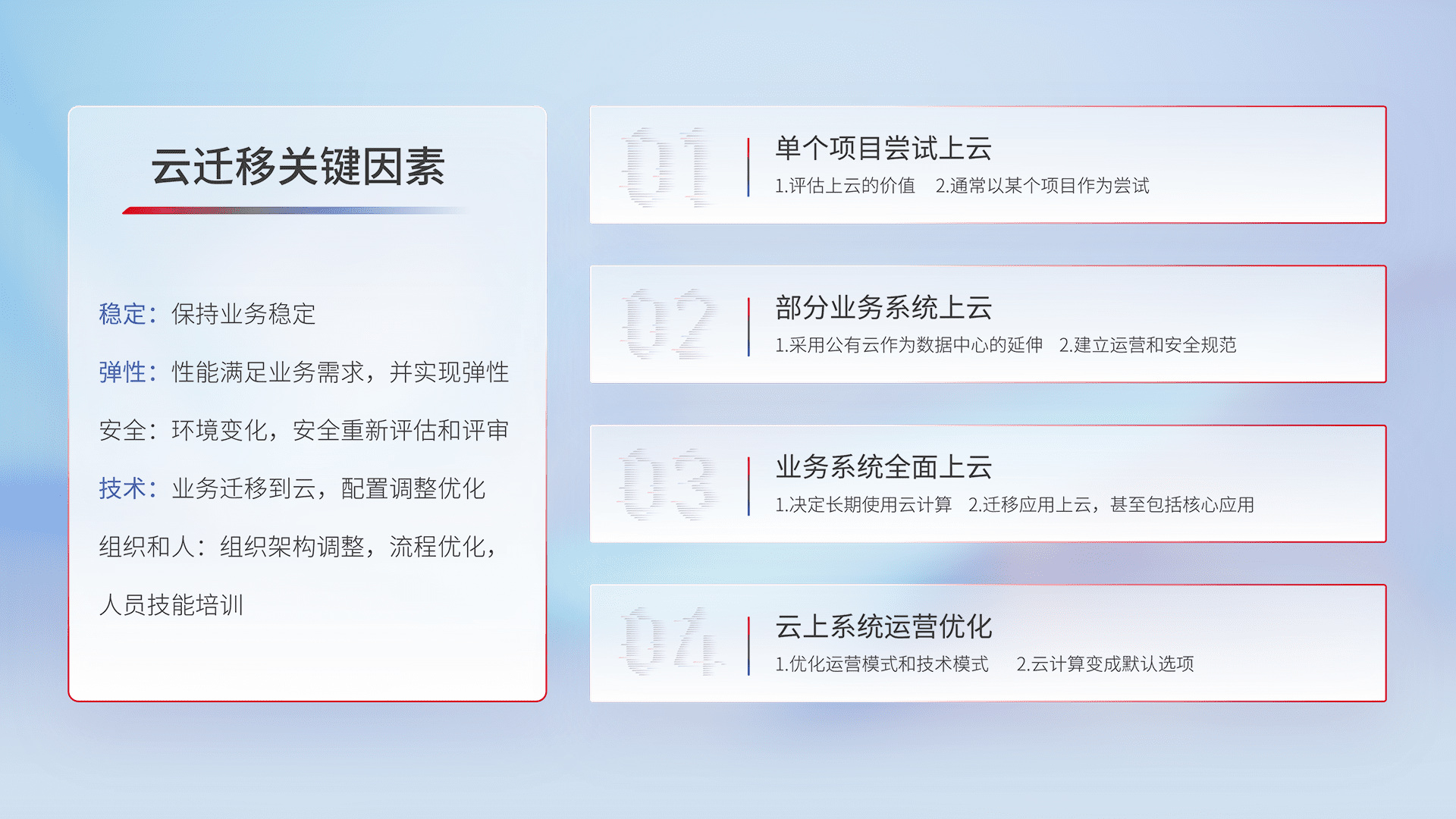 结合实际业务,,,,从规划设计、、、、云平台选型、、云原生改造、、数据迁移、、、、集成交付,,迁移全过程为客户识别最佳上云路径,,做好风险识别管理,,,,设计网络架构、、、、身份权限、、、、安全审计合规、、、操作审计、、、、日志审计、、监控告警策略、、、、多站点容灾设计等,,对云上基础设施进行整体规划,,,,提升IT治理水平,,,,以满足弹性、、、高可用、、高性能的需求。。