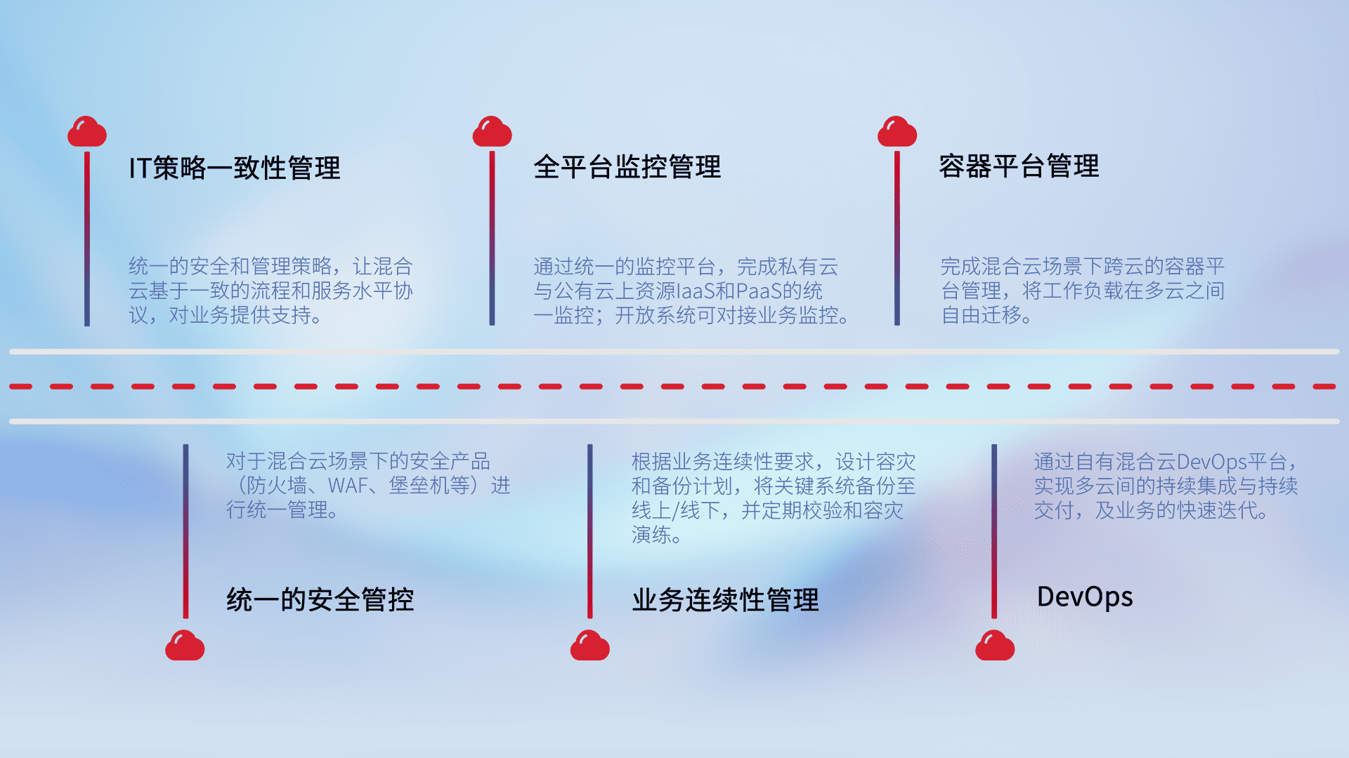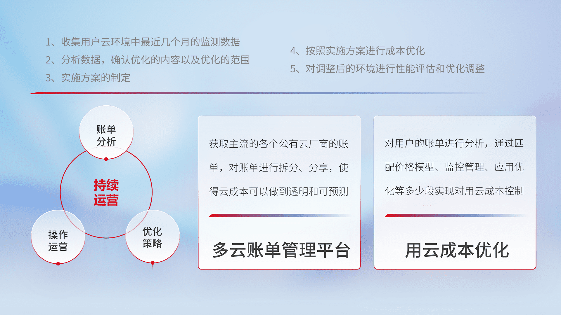 通过多云纳管,,以统一的资源数据模型把客户的云资源进行抽象和封装,,,,进而实现对多云资源的统一操作,,保障云资源管理的可靠性、、稳定性与可用性。。量身定制化运维内容,,,配置、、开发运维、、、、补丁管理、、、备份、、、、监控、、认证和访问管理、、、审计和日常巡检等,,保障在用云过程中的可靠度,,,,稳定度以及高可用率。。。。